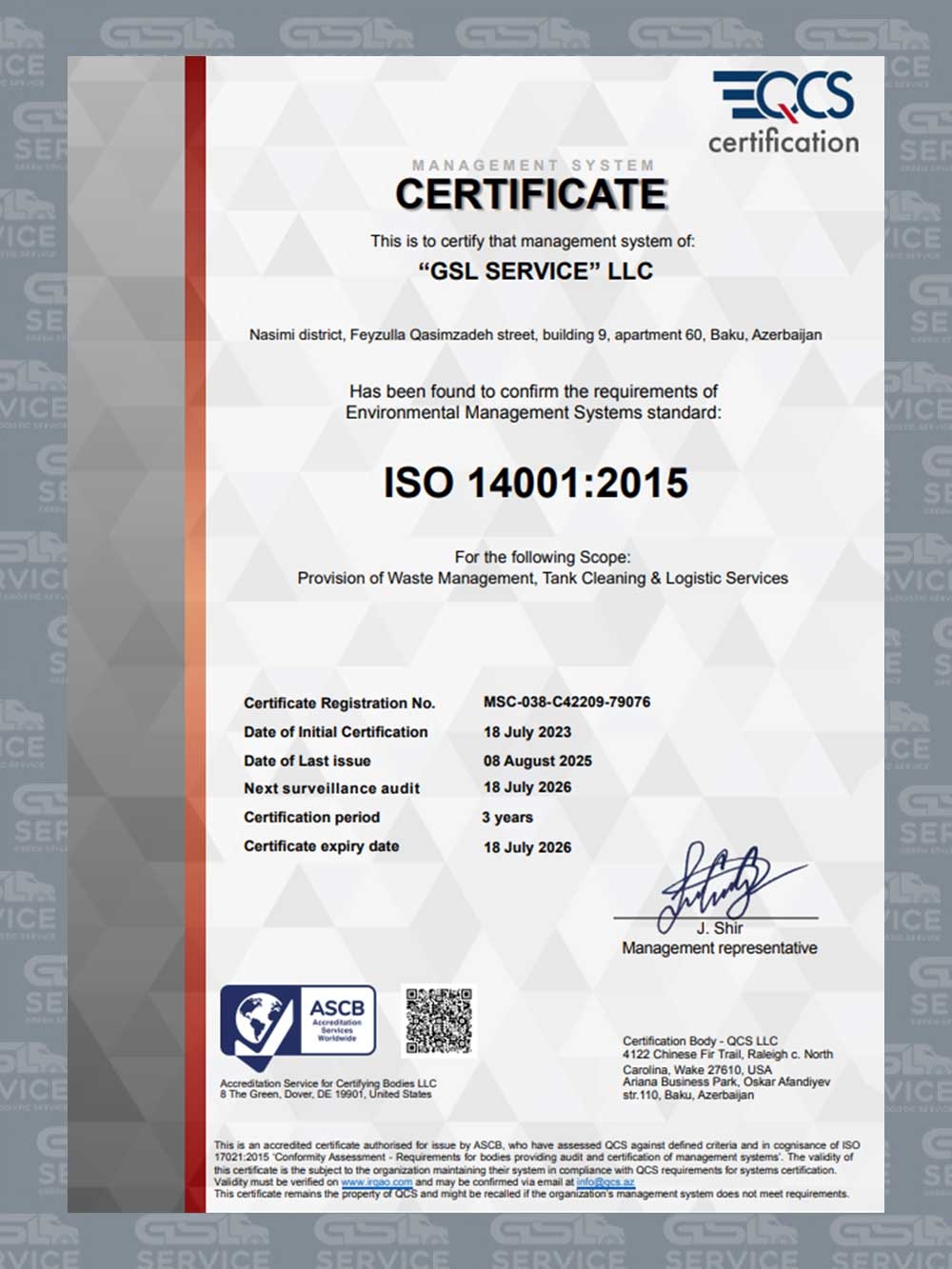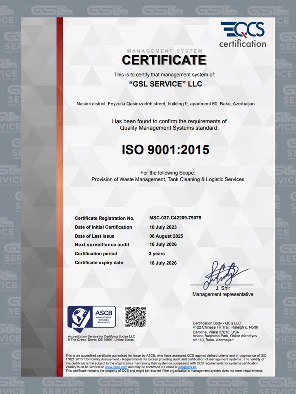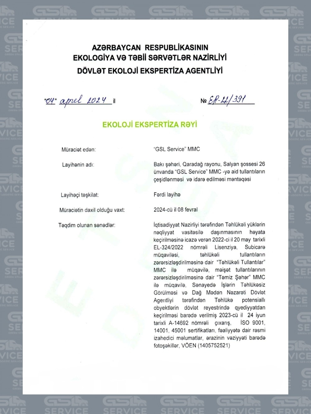2021-ci ildə yaradılan GSL Service MMC fəaliyyət müddəti ərzində ölkənin ən nüfuzlu şirkətlərindən biri halına gəlmiş və tullantıların daşınması və çeşidlənməsi sahəsində öncül rolunu qorumağı bacarmışdır.